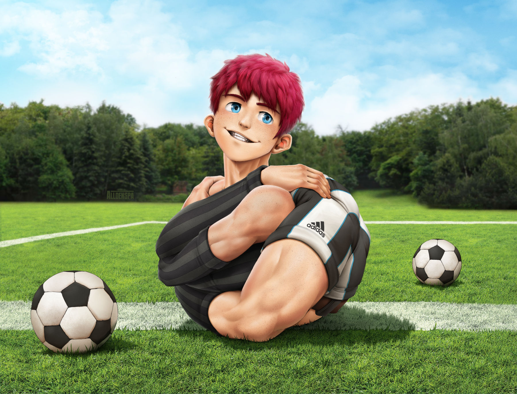 He began by curling backward, folding his spine in half like it was absolutely nothing. With a little push, he cleanly got his shoulders past his thighs in a Ruppelbend. After that, he got down on his knees, crossing his calves in front of him. He casually used his hands to tuck his feet beneath the opposite leg, hiding them and ensuring he wouldn’t need to hold them close to him by himself. As he pulled, the shape of his legs began changing a bit as well. His calves and thighs actually curved around his body. With his legs in position, he just had to keep his arms crossed over his chest for him to serve as the perfect oversized soccer ball. His head did poke out from the shape, but that never bothered either of them.