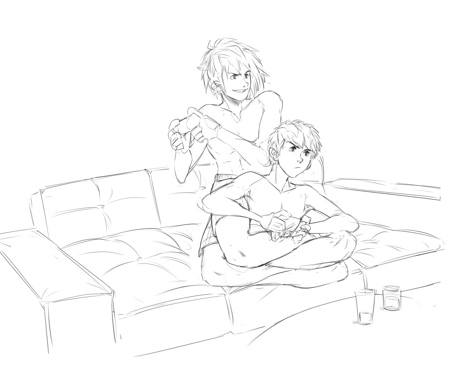 A couple of hours later, they were clean, well-fed, and ready for a fun gaming session to close out the day. It was summer, so they chose to just stay in their shorts and nothing else since they weren’t going to leave the house anyway. Both of them rushed to the living room after helping out their parents with the dishes. It was a simple setup, a large couch in front of the TV. Though, with the way they usually played, an armchair would suffice for the two.
